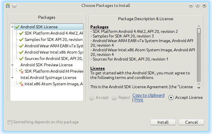After the first launch of "Android SDK Manager" it automatically detects the most important packages to install. So, we don't need to worry about potential selections. The only thing we should do in this window is pressing the "Install" button. Afterward, on your display should appear a window containing license agreements. To download packages you are obligated to accept them. At the end, we need to press "Install" button once again, but this time it is located in the currently window.
