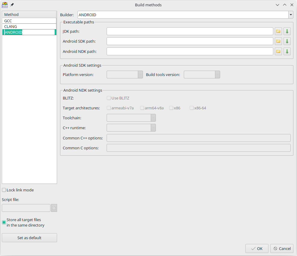 Now we are going to tell our builder where NDK is located. To do that open "Build methods.." and select "ANDROID" build method. The one we created in "Creating Android builder" paragraph. Next, you have to specify NDK directory in "Android NDK path" edit field. After successful Android NDK connection with the builder, fields "Toolchain" and "C++ runtime" should be detected automatically. At the end, we are saving changes in our build method by clicking "OK" button.
