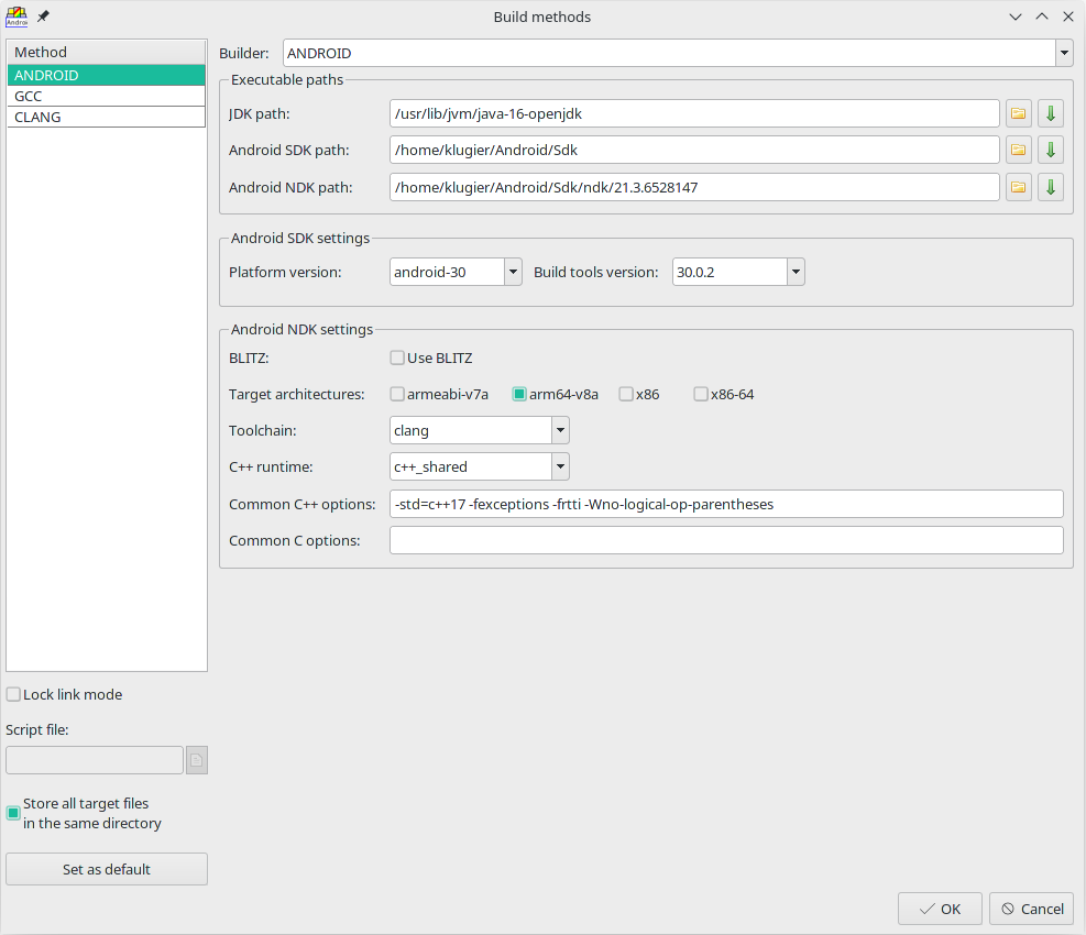 Android builder is a powerful tool, so it allows configuration. Below is a list with all options grouped in two categories. The first group described options related to Android SDK. The second one is related to Android NDK.