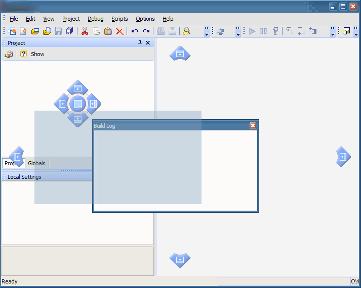 1. Start dragging the "Build log" window. We can see the hints appearing on the center of the docked window (the mouse cursor is in the docked window area so it is active) and on the borders of all its containers (in this case, the main container only).