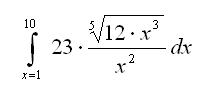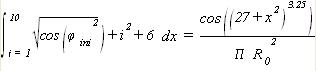 Drawing drw = DrawEquation("integral(sqrt(cos(phi_ini^2)) + i^2 + 6, i = 1, 10)*dx = cos((27+x^2)^3.25)/(PI*R_0^2)");