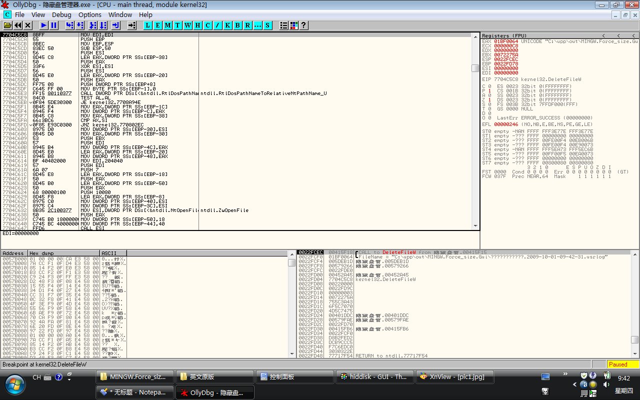 This is the screen shot of OllyDBG. In the parameter of DeleteFileW the Chinese words become a series of "?".