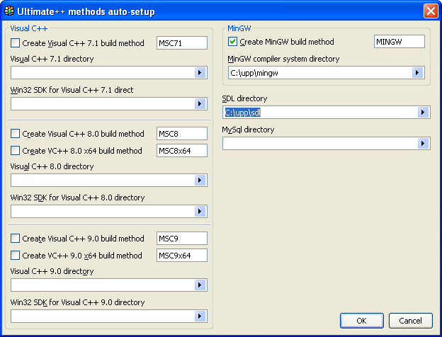 I've just installed the new upp-win32-1579.exe. While installation I've checked both the VC7 and also MinGW (which I cannot find at "C:"). Now I cannot compile the most examples, nor my own projects, I always get this dialogue only: