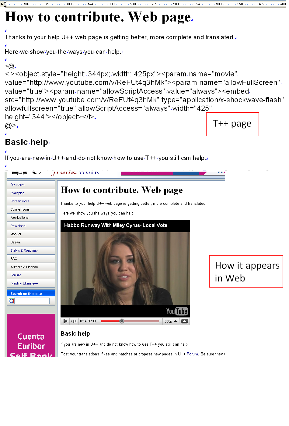 The advantage of including this in T++ help files is that it is not necessary to include the html text in C++ code. Uppweb application just parses T++ pages. If it finds the above sequence and just considers it is pure html.