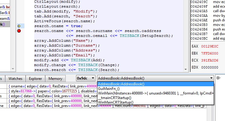 | dolik.rce wrote on Sat, 06 November 2010 19:22 | The stack should be available to browse using the drop-down list under the source view area. If you want to copy the full backtrack there is an option for that in Debug menu.