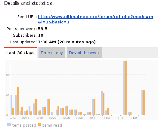 The RSS feed I'm using to keep track of messages on this forum suddenly started to act weird. I guess it might have something to do with the upgrades. The url I use is the one mentioned below the main category list: http://www.ultimatepp.org/forum/rdf.php?mode=m&l=1&b asic=1. In the past, it was updated very often, many times a day, so I had always fresh informations in my google reader. Now, it is only updated every couple of days, when a big bunch of all messages comes all at once. See the graph: