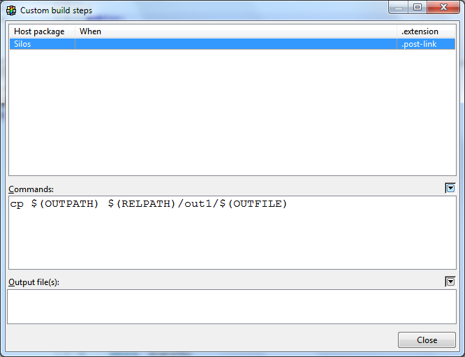 And there is "f:/SOURCES/Silos/TEST_OUTPUT" directory where we keep a number of config files and data. So I wish that a new binary is copied there as automatic build step. The problem is TheIDE doesn't understand $(PROJECT) macro and custom post-link command cp $(EXEPATH) $(PROJECT)/TEST_OUTPUT is executed by TheIDE as cp C:\upp\out\PROJECTS\MSC9.Debug.Debug_Full.Gui.Io.Mt\Silos.exe /TEST_OUTPUT