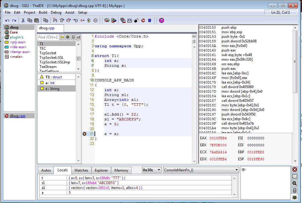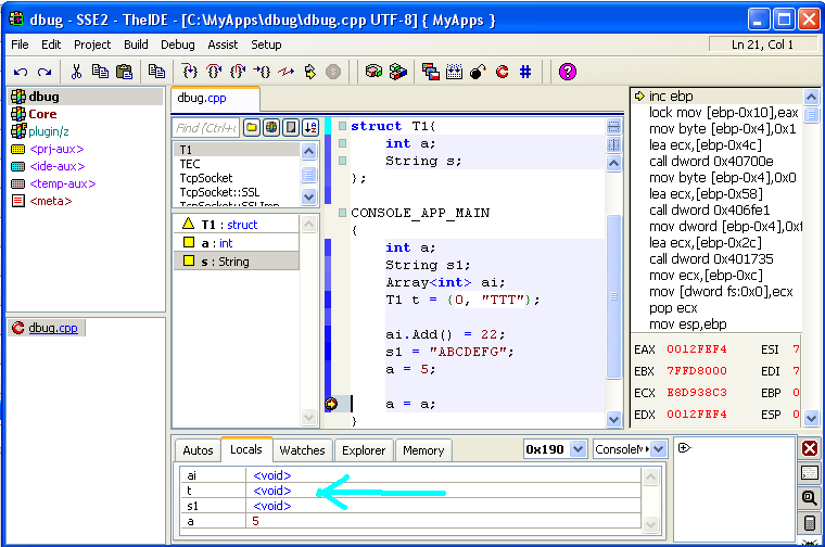 Home » U++ TheIDE » U++ TheIDE: Other Features Wishlist and/or Bugs » Bug: String and others composite types are evaluated as "<void>" in debugger