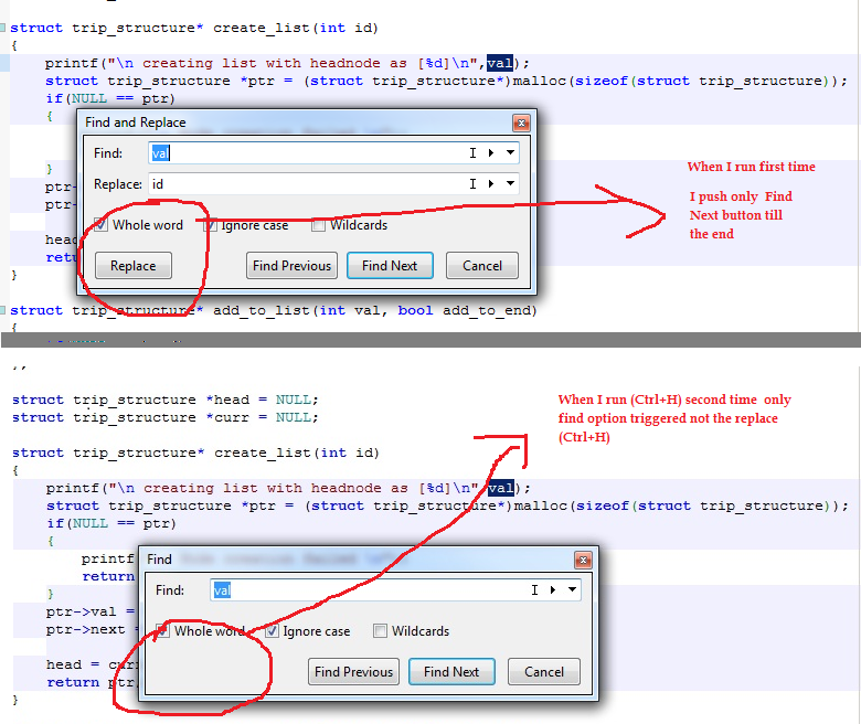 Hello Developers of Ultimate++. Greetings and Respect. I think I have a bug in find and replace function of IDE. When I wanted to replace (Ctrl+H) a word in a source code sometimes I have the replace button but sometimes I don't. I am sending two files. This problem occurs when I firstly run (find and replace) function till the end of code but when I re-run second time only Find option triggers not the Replace. I am sending a picture of it..