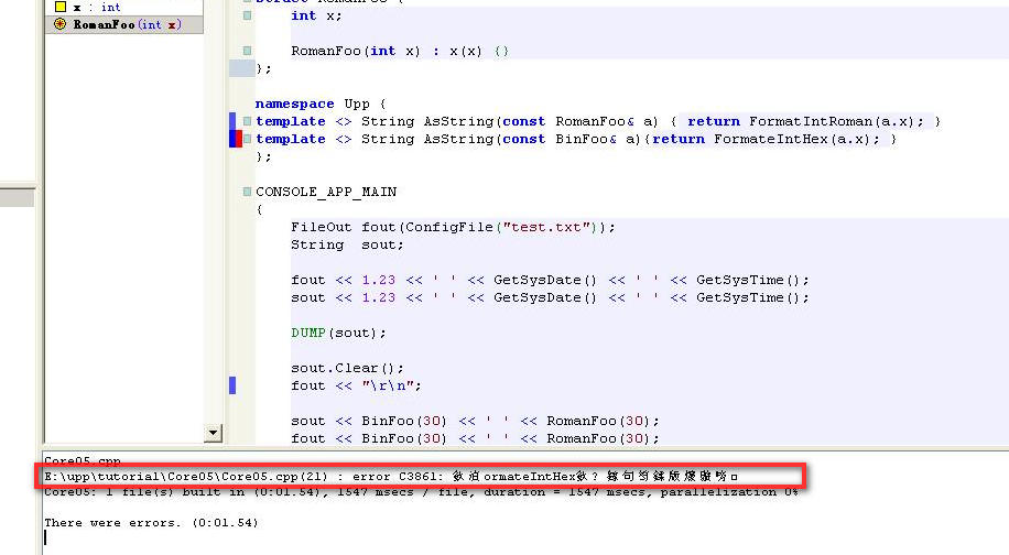 Which upp build are you using ? Under win 7, I am running 5878 version. If you delete the second template function, the source file should compile without any error.
