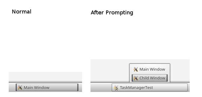 If the program presents a prompt before executing the dialog, the dialog and main window show up separately on the task bar. The prompt doesn't;