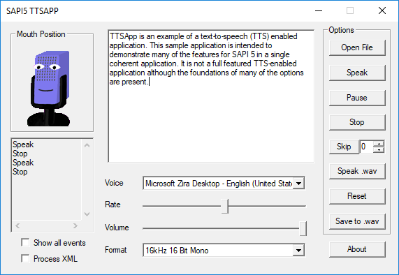 hr = pVoice->Speak((LPCWSTR)in, NULL, NULL); //play it