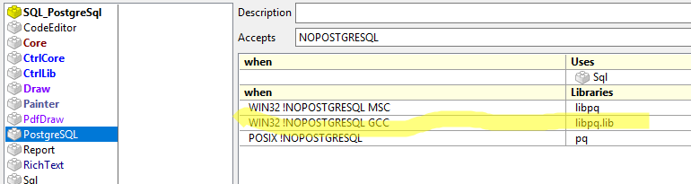 I will return at a little later time once I get another version set up and see what I can't figure out about why I couldn't get U++ up and running with postgres on mingw.