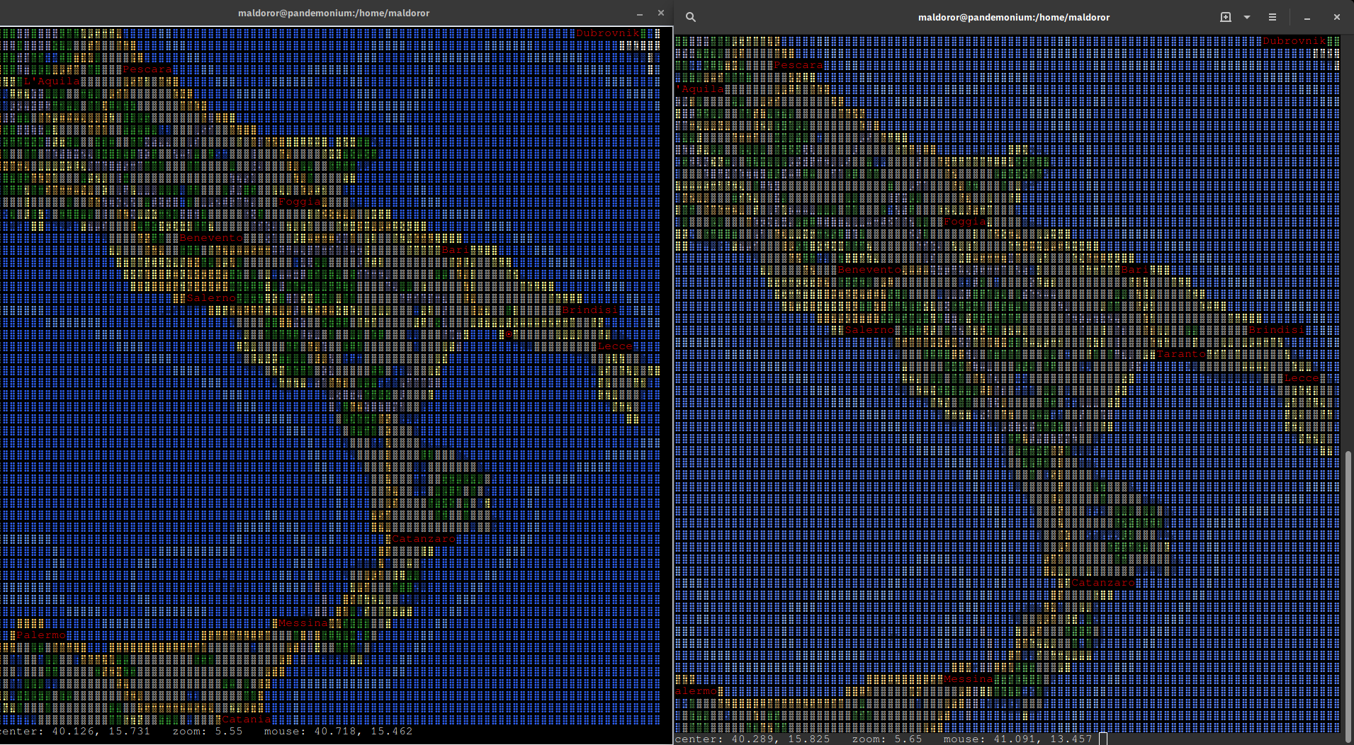 Below was a sort of "final boss" for the first release. It shows the mapscii, an OpenStreetMap implementation for terminal devices, running on the above code and on Gnome-terminal.