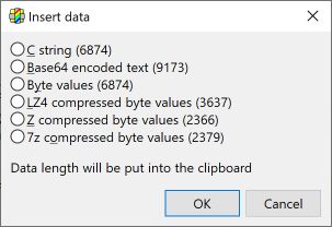 This two new functions refactor some previous operations into single dialog, while adding compresison options. Useful if you need to add some small data, possibly binary, into your code: