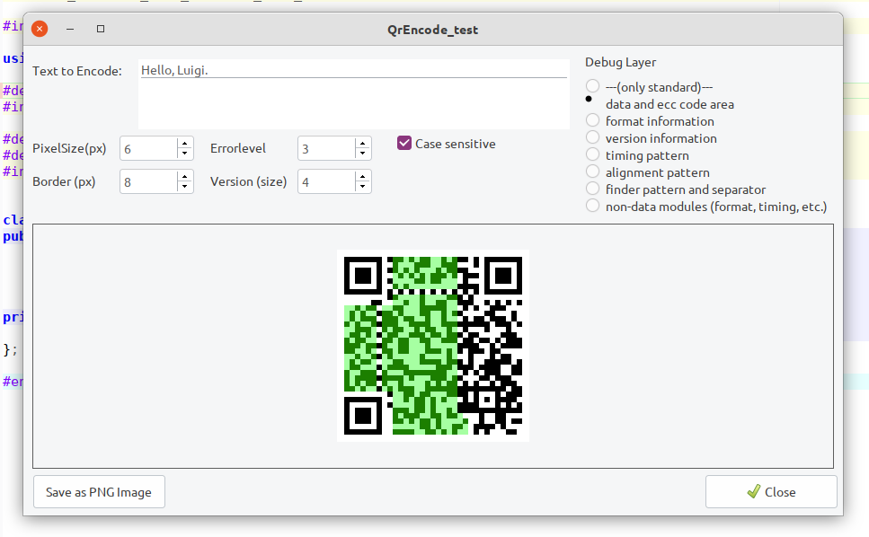 In test program you can show colored elements of QR encoding.