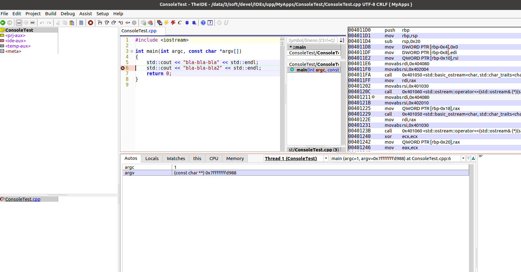 Breakpoint 1, main (argc=1, argv=0x7fffffffd988) at ConsoleTest.cpp:6