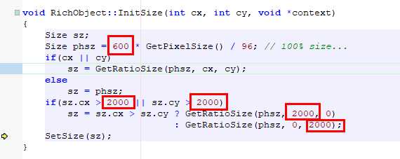 The final target of RichText is printer. So pixel values are sort of irrelevant. U++ has two coordinate systems (only...): Screen pixels and 600DPI laser printer "pixels" (these are called "DOTS" . So what you see is an attempt to approximately convert screen image size to paper. As most displays are 96DPI, we get 600/96 ratio. And those 2000 values are just sanity limit. But also beware that those "dots" are then converted back, so e.g. changing this to 1/1 does not help.