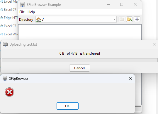 3. I try upload a small text file, such as test.txt, only 47byte, it seems error. However, it create a 0 byte test.txt file in SFTP server if I use other software to checking.