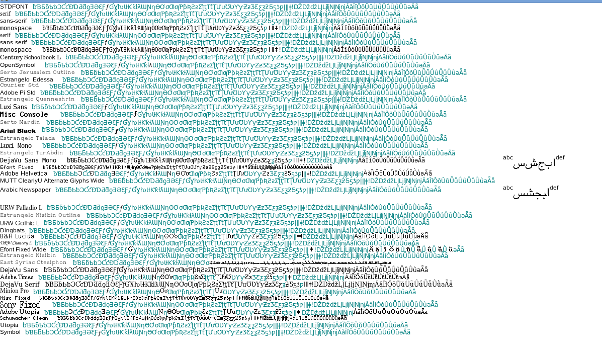 But for further Unicode sections the situation changes. These characters start to look less and less Latin, so the problem of substituting with a similar font starts to diminish. I mean, using Arial to draw an 'a' next to a strange fork like character might be a better choice than using Times, but it wont really make a difference. So here I will also use a single font for substitution.