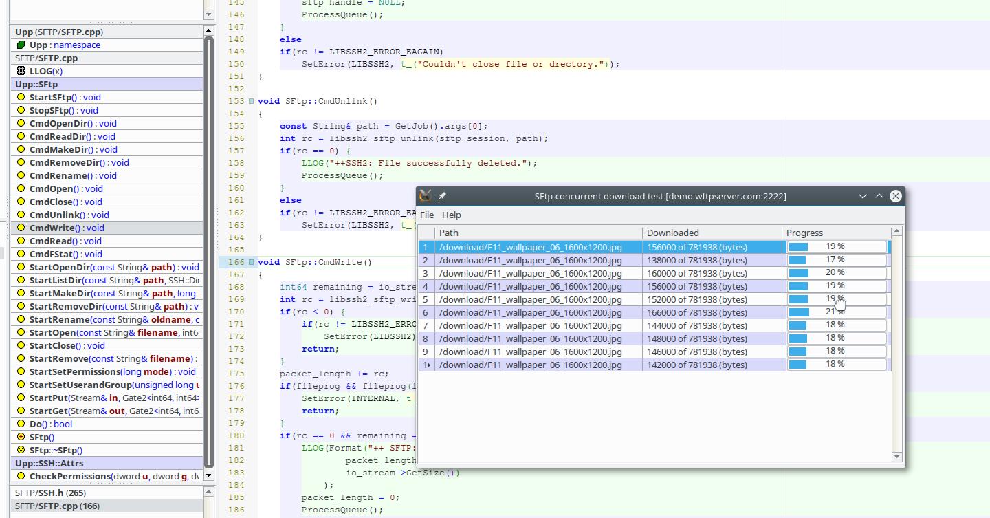 Below is a screenshot of a very simple (and easy to write) sftp downloader example with 10 concurrent downloads, demonstrating non-blocking/async operation capabilities.