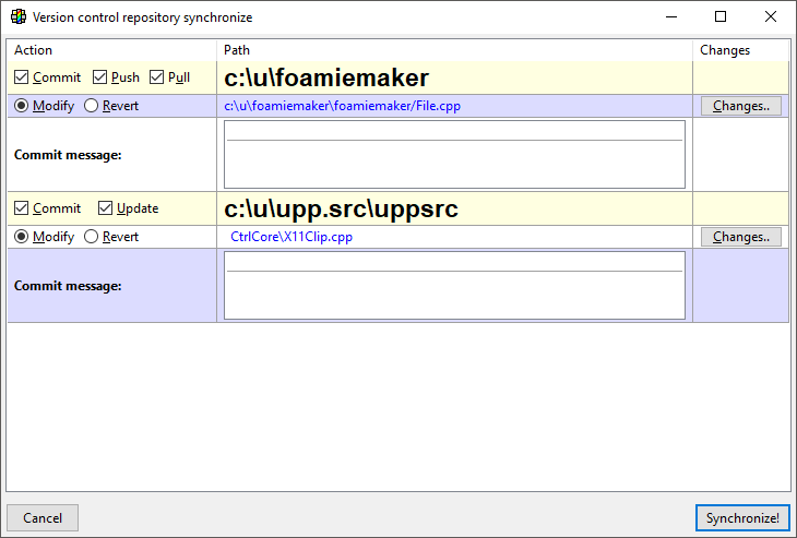 Both SVN and GIT now supported, Sync now allows to choose what actions are done with repo (Commit/Update for SVN, Commit/Push/Pull for GIT).