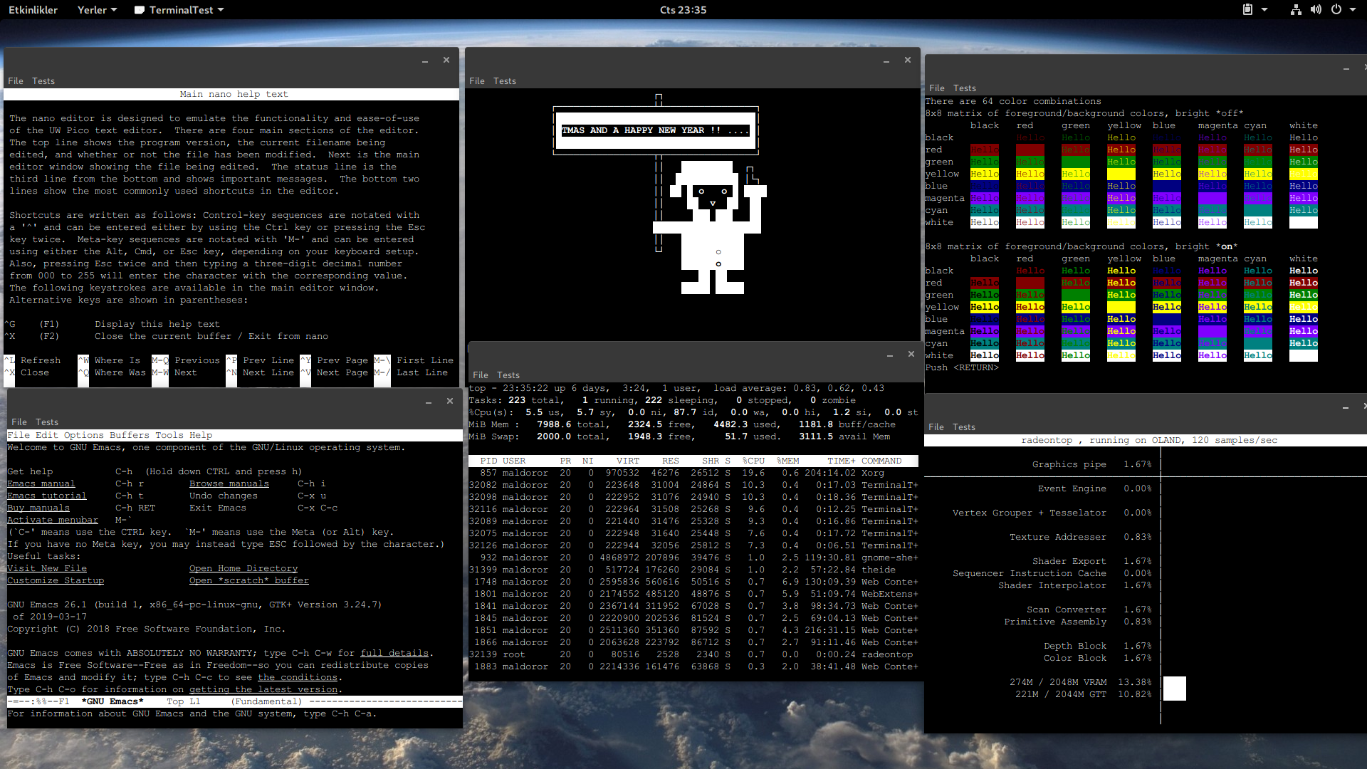 (On a humble test setup (Linux 5.0/Gnone/relatively old test AMD machine. Top row: Nano editor, AnsiArt, Vttest. Bottom row: Emacs, Top, RadeonTop).