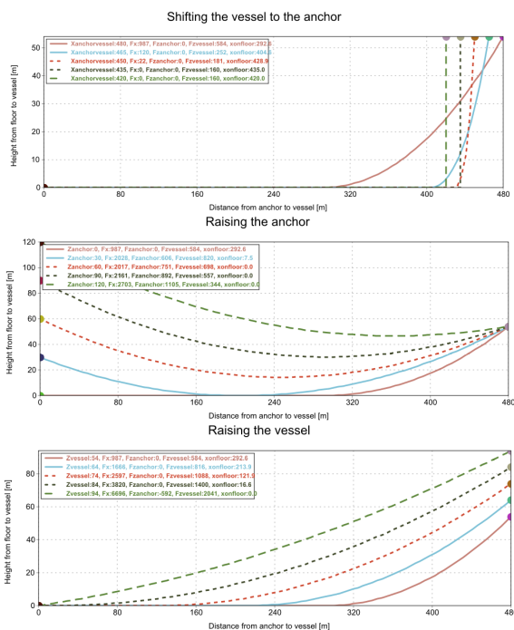 Catenary functions for single mooring line calculations considering sagging and sea bottom.