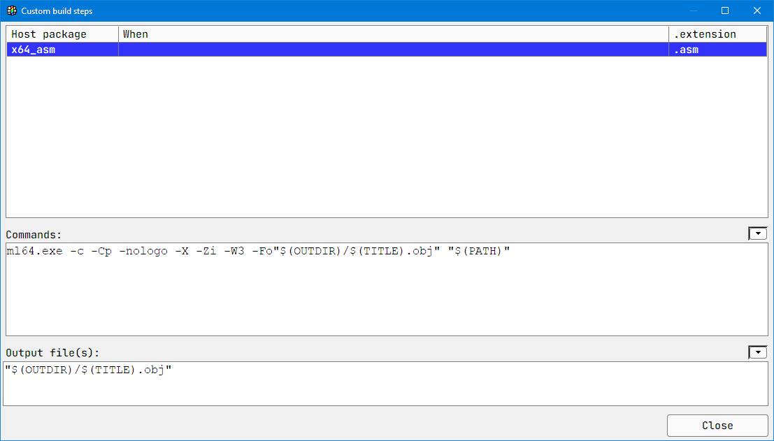 I am trying to assemble and link with a .asm file for a 64 bit application. Using MSVS19x64.bm as the build configuration.