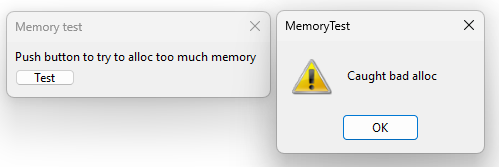 When pushing the button 5 times, no problem happens. Visually monitoring the Windows Task Manager, MemoryTest.exe seems to use the same memory all the time.