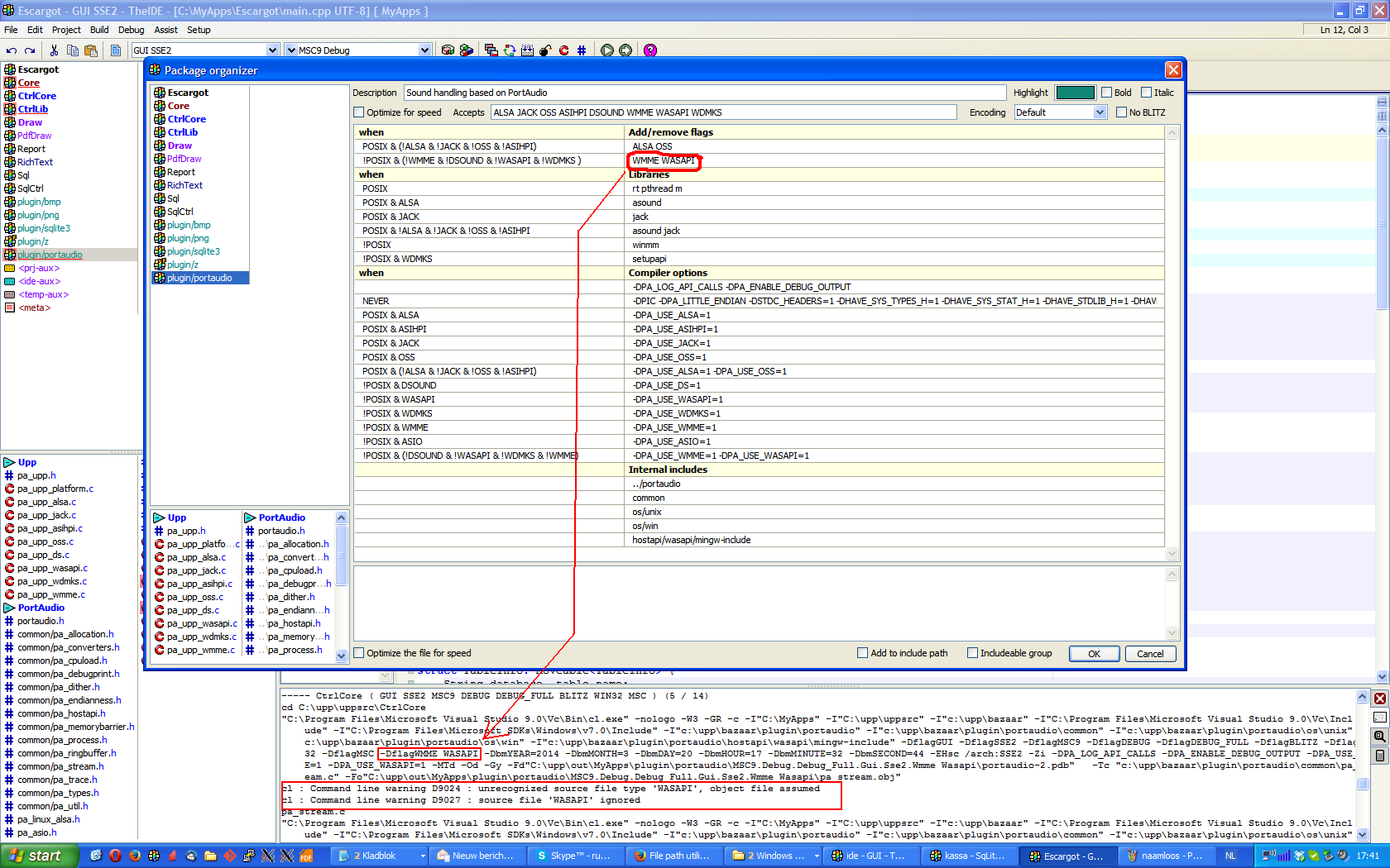 Regarding the issue with two flags separated by comma: TheIDE eagerly quotes the string, saving it as flags(WHEN) "FLAG1,FLAG2" If you manually edit it to remove the quotes, like: then the code actually works Unfortunately, the code that writes and reads this is used across multiple other options (link flags, uses, targets etc.) where the quoting is necessary. Another issue with this is that the code that saves the additional flags breaks it apart and saves it into two separate lines as soon as you do any changes in the .upp file. So it is probably easier to just add multiple lines... But I'll try to think of some simple way to make it work anyways, perhaps it'll be possible without duplicating too much code.