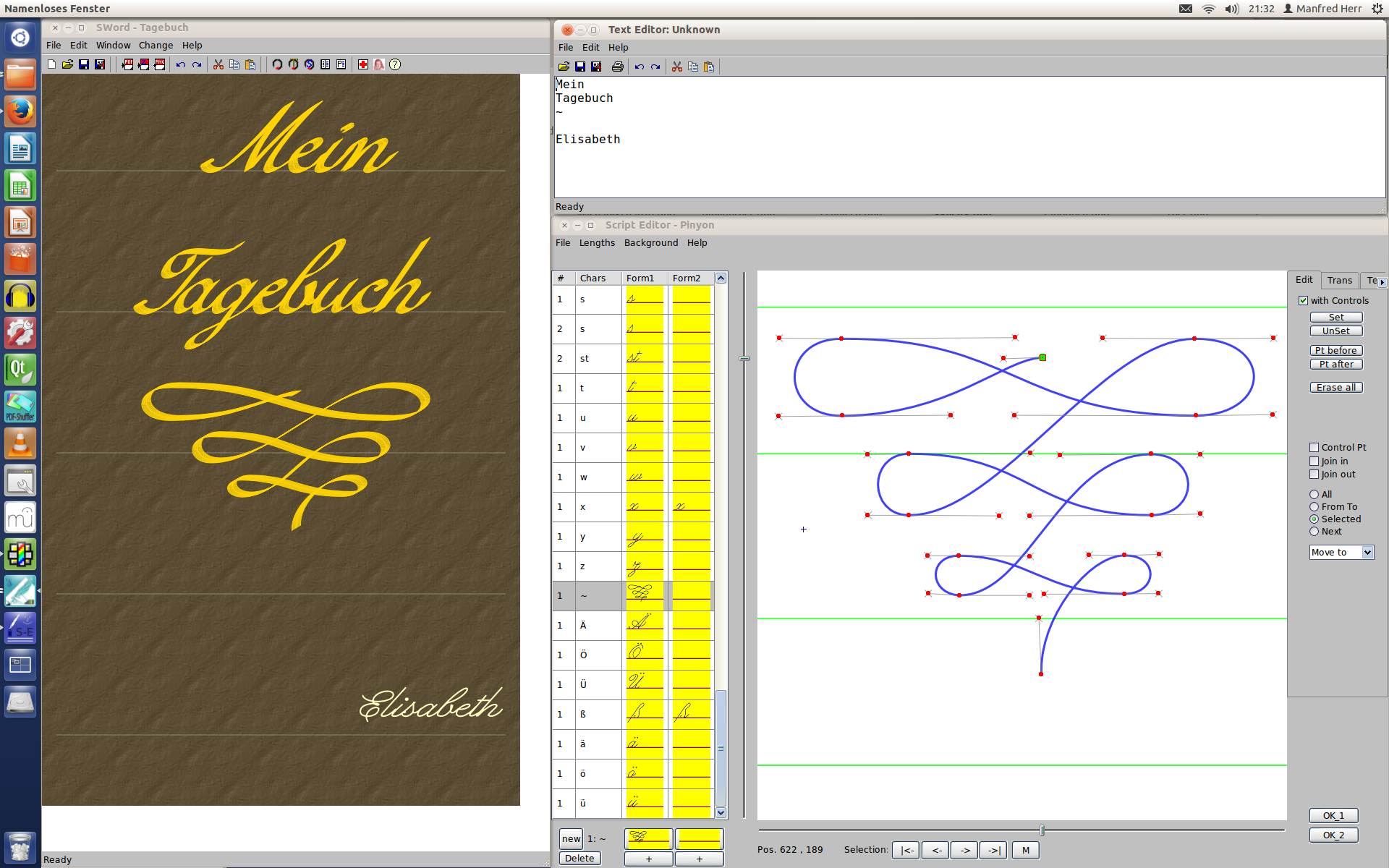 splines to simulate handwriting, hence the name Sauklaue. If your not capable of the German language then comment the language statement at the beginning of the main function to turn it into SWord and English (default).