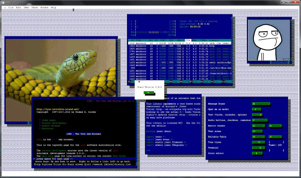 The "final boss" for this release was the jexer support. Jexer is a modern text user interface and window manager that runs inside terminal emulators. (It is an advanced terminal multiplexer.)