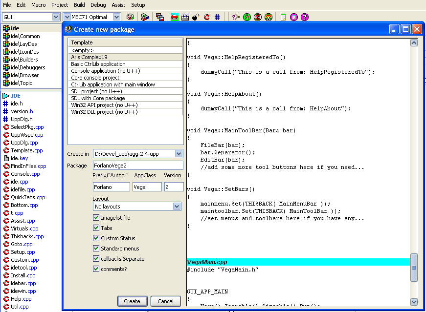 1. It seems you've created your own version of the "create new package" dialog (with a nice icon!), perhaps based on existing upp code ??? - can't you submit this as a "third party tool" though? Why do you need theIde package dialog to change ??