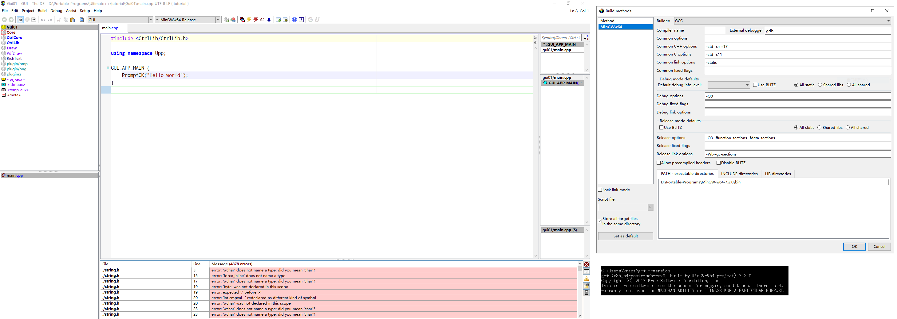 The problems happened in package Core, where the compiler reports "wchar does not name a type". This screenshot is really using my own MinGW-w64, but the official "upp with mingw" reports exactly the same error message.
