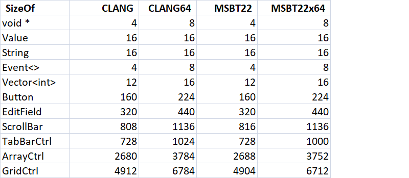 After the change, sizeof(Ctrl) is reduced from 152 bytes to 144 bytes on 64bit platform (both MSBT22x64 and CLANG64), while on 32bit platform, it remains unchanged with CLANG, but increases by 8 bytes with MSBT22. This increase is unexpected. If anybody can explain it or figure out a way to avoid it, it will be fully appreciated.
