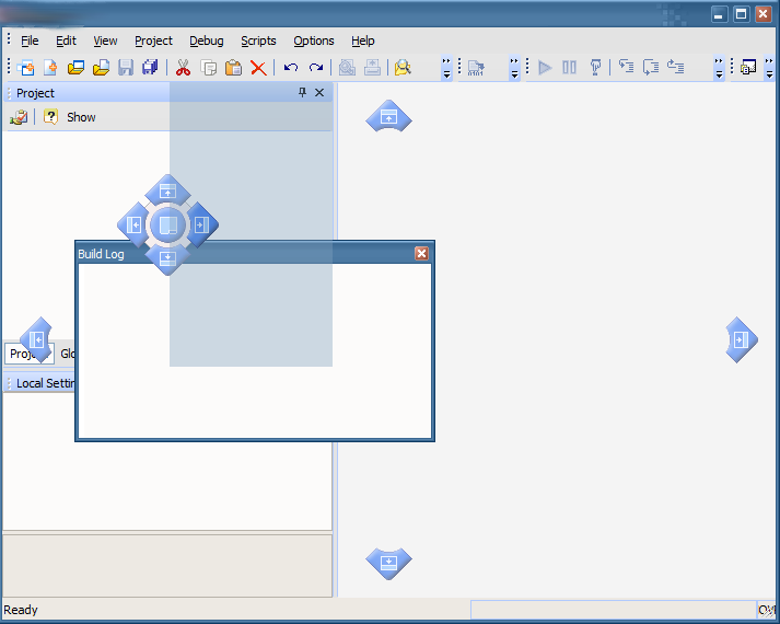 1. Start dragging the "Build log" window. We can see the hints appearing on the center of the docked window (the mouse cursor is in the docked window area so it is active) and on the borders of all its containers (in this case, the main container only).