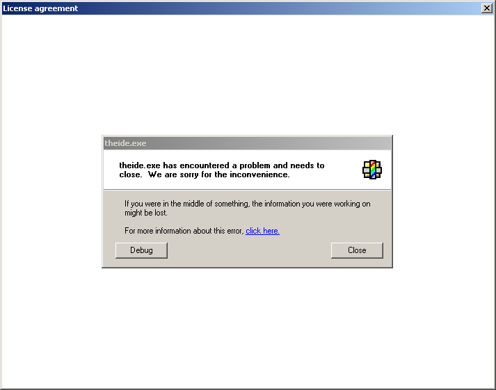 Yes theIde.exe seems to execute correctly, and offer the license dialog if I manually start it after the mentioned crash.