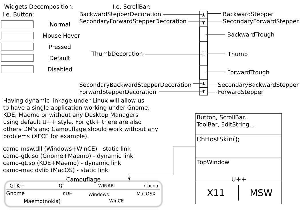 I know that in U++ the rule is to avoid dynamic linking but I think we may do an exception if with that we acquire integration with Gnome, KDE, XFCE, Maemo using single executable and 2 *.so for gtk+ and qt. If the user is not running any of these environments the application will use U++ look. However it's not an obligation to use a so lib, if someone know that his application will run only on (i.e.) Gnome he may link statically with so (lib) responsible for application look. I've named this part (so/dll) Camouflage (you know Chameleon->Camouflage ) and this part is what I'm willing to do for my graduation thesis (I think I have 3 months to finish it). If everything goes as I planned at the end we will have only one single ChHostSkin (see ChWin32, ChGtk) function, data acquisition being done by my library. About applications performance, I think that will not affect application performance because look is acquired only once at start-up (as now with ChGtk/ChWin32 implementation) and only when system theme get changed.