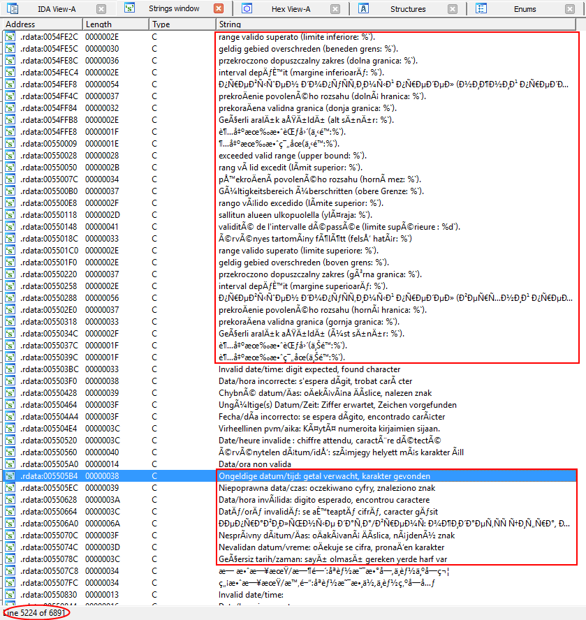 The image below shows a few example strings. They are located in Core.t and I assume they are translations for an error or information message in multiple languages. However, in the disassembler you can see that they are all compiled into the executable. I did not measure this, but an educated guess on Core.t, which is 44 kb (~ 40 kb with margins of non-trivial information) is linked into the executable. If just the english translations are linked into the executable, the size could be reduced by roughly: average string length divided by the number of languages built into U++.