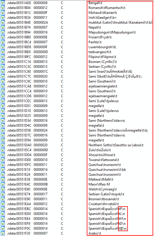 The image below shows the language array in LangInfo.cpp. The big rectangle shows the strings that are linked, which are a hell of a lot and they shouldn't be necessary.
