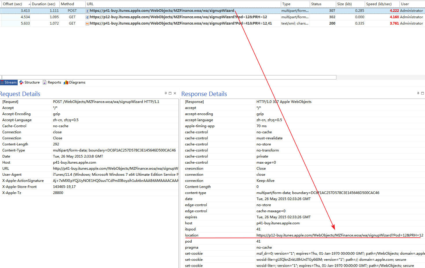 See the first url Response Details, the location is https://p12-buy.itunes.apple.com/WebObjects/MZFinance.woa/wa /signupWizard?Pod=12&PRH=12